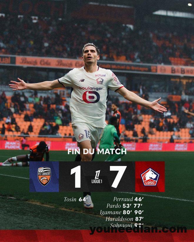 雷速体育8月31日讯 稍早前结束的法甲联赛中,里尔客场7-1狂胜洛里昂。
