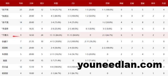 对阵青岛U17的比赛中,于善元仅仅登场16分50秒,13中11,罚球3中2,拿到24分9篮板(6前场篮板)2助攻3盖帽,命中率83.3%的数据,对方2.02米的尹翊华根本无法限制他分毫。