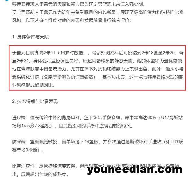 于善元才17岁,他的骨龄预测有希望突破2.18米甚至是2.20米,他从小就接受系统化的篮球训练,他的父亲是前辽篮名宿于学鹏指导,他的篮球智商、运球技巧都比一般超过2.1米的大个子出色的多,尤其是吸引包夹传球的能力有些杨瀚森的意思。