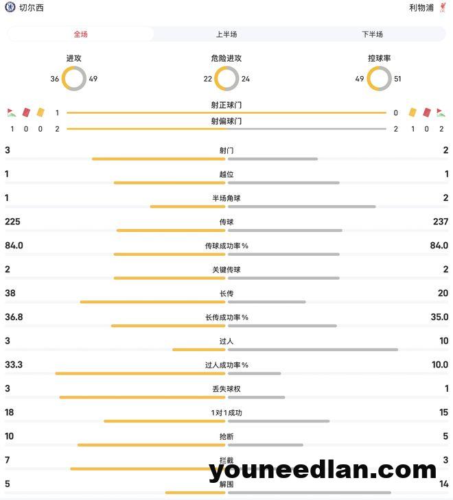 切尔西vs利物浦半场主要数据: