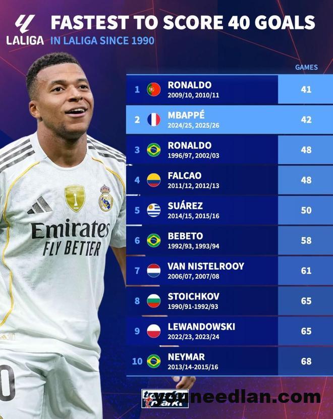 根据德转的统计,姆巴佩42场打进40球的数据是西甲自1990年以来达成联赛40球大关的第二快纪录,仅次于C罗的41场40球,领先于大罗的48场40球。