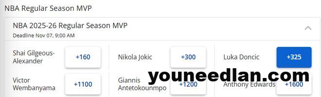 最新MVP赔率显示,东契奇是+325,暂列第三,但已经非常接近第二的约基奇(+300),而亚历山大(+160)目前排在榜首。
