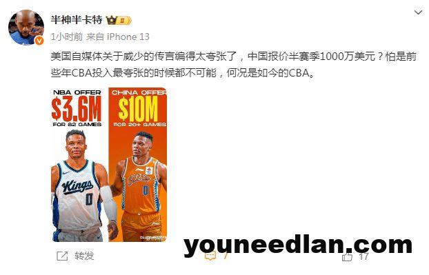 要知道,CBA球队一个赛季的总投入基本不超过1亿元,也就是不足1400万美元,根本不可能因为威少一人就投入接近3000万美元,因而如此谣言根本没有任何可信度。