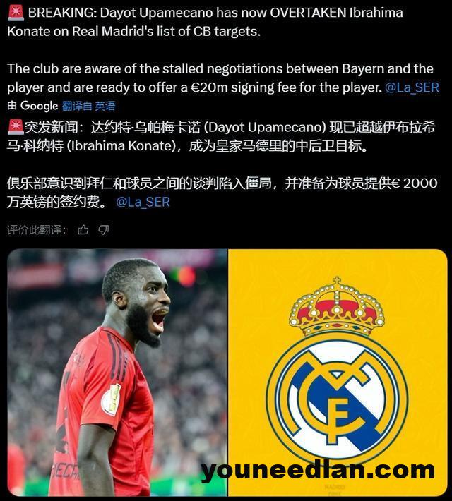 然而,原本看上去板上钉钉之事,如今却发生了天翻地覆的变化。科纳特开始质疑皇马的真实意图,并开始后悔未与利物浦进行续约谈判。于帕梅卡诺之所以迅速上位,不仅因为皇马同样可以免签,更因高层认为他兼具的身体与技术素质,完美契合阿隆索欲打造的新防线哲学——科纳特,只能暂居次席。