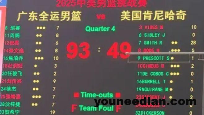 这支美国肯尼哈奇队,后卫不行,内线也没有身高,不过说实话,广东全运会男篮实力确实很雄厚,最终,广东全运会男篮以93比49大胜美国肯尼哈奇队,而且胡明轩伦轩还没有上场。
