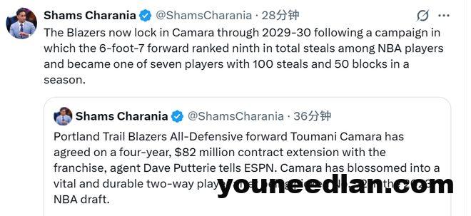 此次续约后,开拓者队将卡马拉的合同锁定至2029-30赛季。上赛季,这位身高6英尺7英寸(约2.01米)的前锋展现出极强的防守影响力:全联盟抢断总数排名第九;成为全联盟仅有的7名单赛季完成“100次抢断+50次盖帽”的球员之一。
