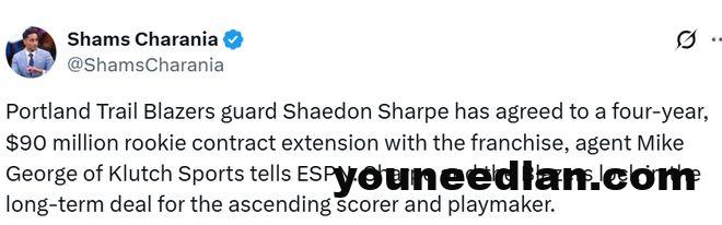 杨瀚森的两位队友都在北京时间10月20日成功续约。据经纪人戴夫-普特里向ESPN透露,波特兰开拓者队前锋塔马尼-卡马拉已与球队达成一份为期四年、总金额8200万美元的续约合同。另据Klutch体育经纪公司的经纪人迈克-乔治向ESPN透露,波特兰开拓者队后卫谢登-夏普已与球队达成一份为期四年、总金额9000万美元的新秀续约合同。