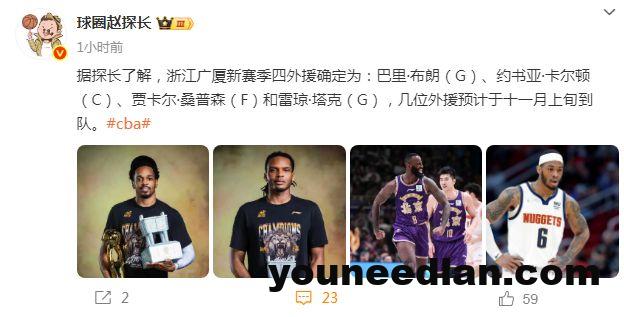 球圈赵探长报道:“浙江广厦新赛季四外援确定为巴里-布朗(G)、约书亚-卡尔顿(C)、贾卡尔-桑普森(F)和雷琼-塔克(G),几位外援预计于11月上旬到队。”