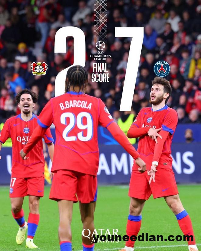 最终,巴黎圣日耳曼客场7-2狂胜德甲豪门勒沃库森。