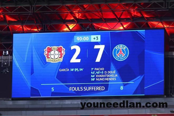 巴黎圣日耳曼7-2勒沃库森,杜埃双响,登贝莱里程碑破门
