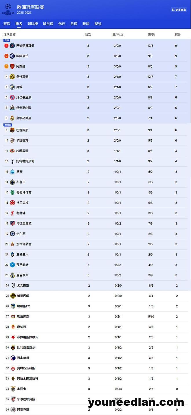 在这场进球大战中,巴黎圣日耳曼7-2获胜,3轮欧冠狂轰13球,凭借净胜球的优势,力压同为3连胜的国际米兰和阿森纳排在积分榜榜首。