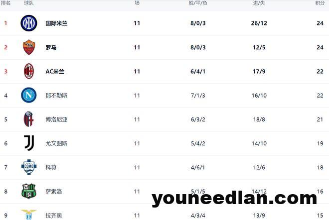 这一轮比赛全部踢完,积分榜易主,国际米兰8胜3负,拿到24分,登顶积分榜。罗马的战绩和国际米兰一模一样,也是24分。但是,罗马的净胜球只有7个,而国际米兰的净胜球有14个。因此,罗马只能屈居第2。AC米兰排名第3,拿到22分。输球的那不勒斯也是22分,排名第4。博洛尼亚则升到了第5名,把尤文图斯挤了下去。尤文图斯只拿到19个积分。