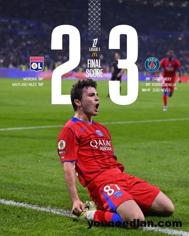 第50分钟,又是长传,里昂凭借奈尔斯的吊射破门将比分扳平,2-2。
