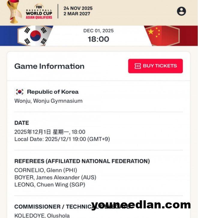 中国男篮将在12月1日客场挑战韩国男篮,现广东男篮主帅、前中国男篮主帅杜锋将解说本场比赛。至于中韩二番战的3位裁判出炉,分别是来自菲律宾、澳大利亚和新加坡的裁判,其中新加坡裁判梁俊容曾执裁过CBA。