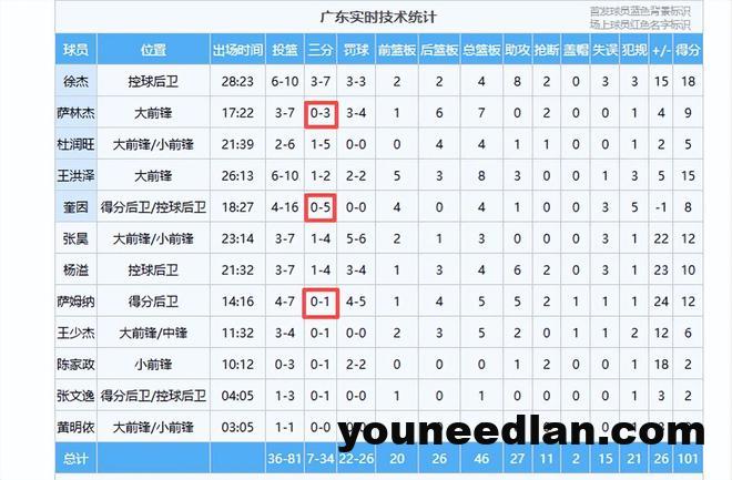 没错,说的就是三分球。本场比赛,广东队三分34投7中,命中率为21%,面对弱旅打出这样的命中率真是太低了。特别是三名外援的三分命中率均为0,奎因没了上一场的手感,5中0,萨林杰3中0,萨姆纳1中0,三名外援的三分命中率均为0,也是奇怪和尴尬了。