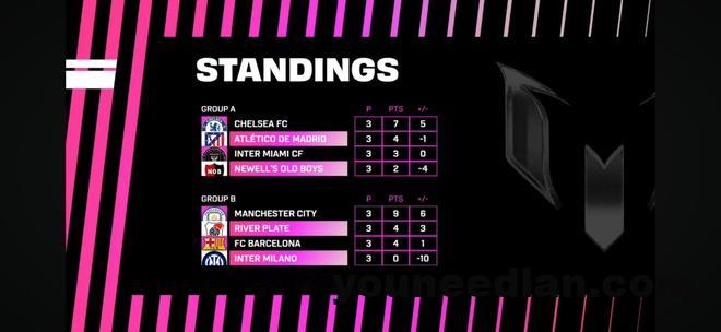 8支球队分为两组展开较量,A组为迈阿密国际、纽维尔老男孩、马竞和切尔西;B组包含巴萨、河床、曼城和国际米兰。
