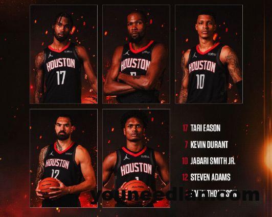 火箭:杜兰特、贾巴里-史密斯、亚当斯、阿门、伊森