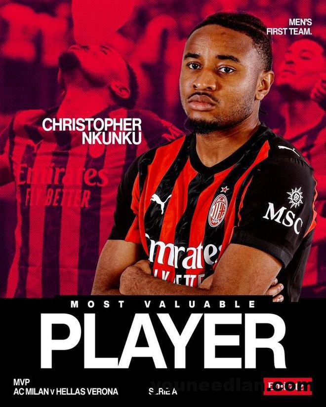 在昨天晚上进行的意甲第17轮比赛中,米兰3-0击败维罗纳,赛后,恩昆库被评为本场比赛队内最佳球员。