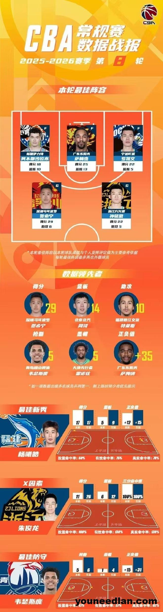 CBA官宣常规赛第8轮最佳阵容,新疆队长阿不都8中7高效18+10+7率领新疆大胜结束4连败领衔,萨林杰25+13率领广东开局8连胜唯一不败领跑,贺希宁29+6+6送辽宁3连败,罗凯文与孙铭徽均是22+5入选,孙铭徽率领广厦送北京首败。