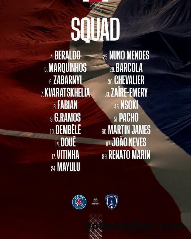 北京时间1月12日,巴黎圣日耳曼官方公布了法国杯对阵巴黎FC的大名单,登贝莱领衔,李刚仁、萨福诺夫、恩贾恩图仍缺阵。
