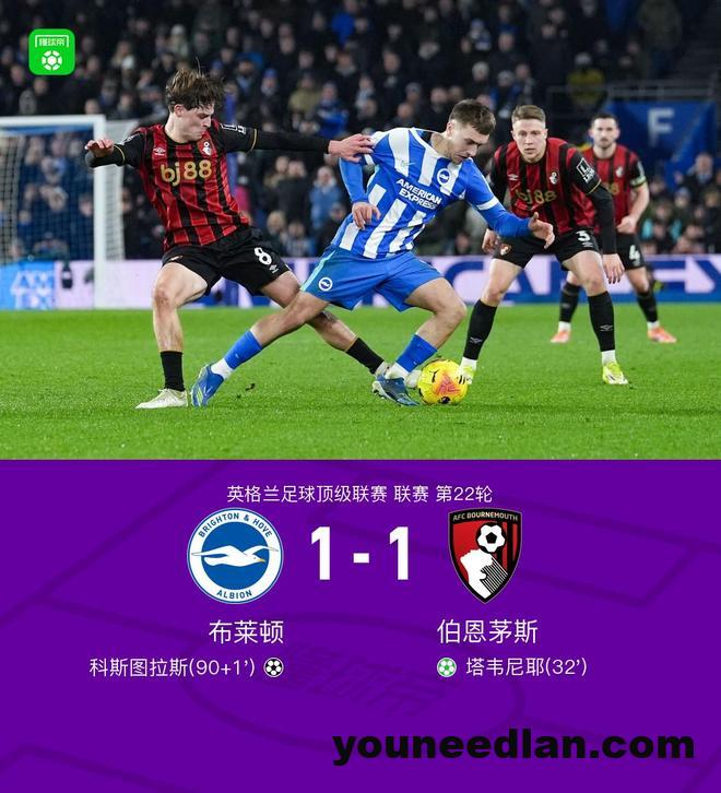 北京时间1月20日英格兰足球顶级联赛 联赛 第22轮,布莱顿主场对阵伯恩茅斯。上半场,阿德利造点,塔韦尼耶主罚命中。下半场最后时刻,范黑克助攻,科斯图拉斯倒钩绝平。全场比赛结束,布莱顿1-1伯恩茅斯。