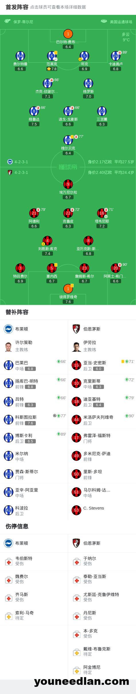 第33分钟,阿德利倒地,主裁改判点球,塔韦尼耶命中,伯恩茅斯1-0