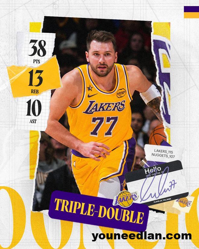 湖人队的东契奇得到38分、13个篮板和10次助攻,勒布朗得到19分、9个篮板和8次助攻,斯马特得到15分,海耶斯得到9分和5个篮板,八村塁得到9分和6个篮板。掘金队的穆雷得到28分和11次助攻,沃特森得到18分和5个篮板,戈登得到18分、4个篮板和5次助攻,琼斯得到16分和5个篮板,哈达威得到10分。