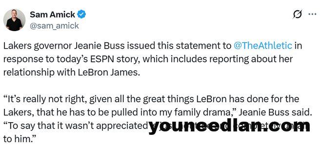 珍妮-巴斯就今日ESPN的相关报道,向The Athletic媒体发布声明,该报道中包含了关于她与詹姆斯关系的相关内容。珍妮表示:“勒布朗为湖人立下了汗马功劳,如今却被卷入我们的家族纷争,这实在太不应该了。说球队不感激他的付出,这绝非事实,对他而言也极度不公。”