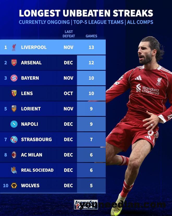 德国转会市场网站列出了五大联赛球队目前仍在持续中的各项赛事最长不败排行,利物浦以13场不败居首,阿森纳12场不败列第二。