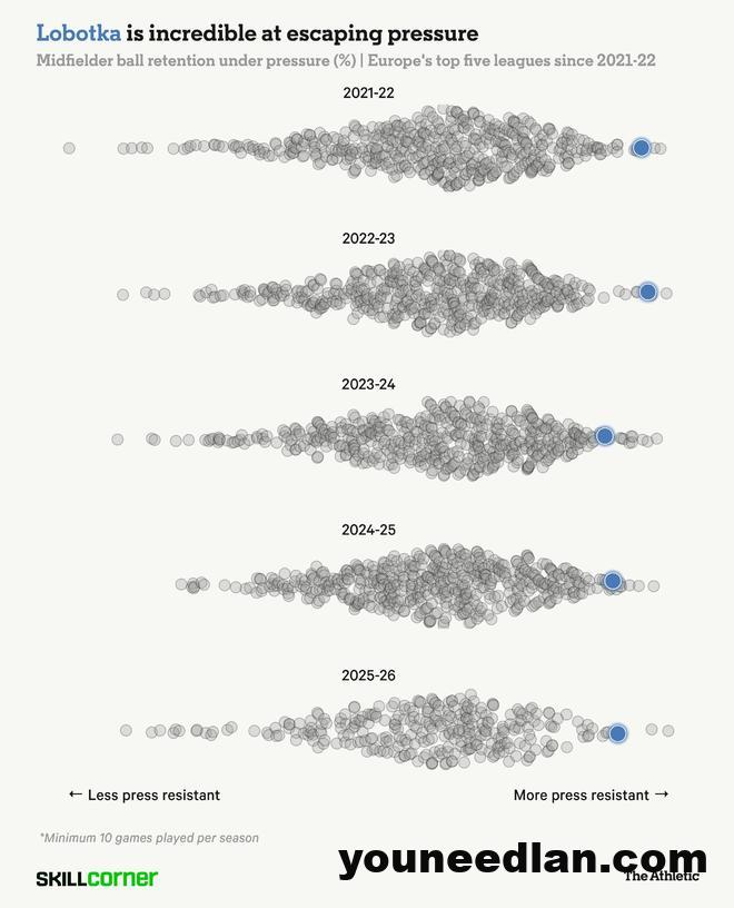 多年来,这位身材矮小的斯洛伐克中场一直是欧洲最擅长抗压控球的球员之一。当The Athletic向他展示SkillCorner数据,证明他在高压下的控球能力时,洛博特卡腼腆地表示:“我真的很惊讶自己能这么出色。”