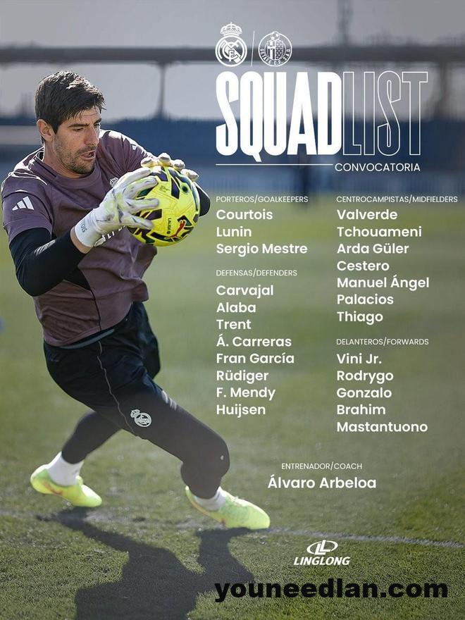 皇家马德里官方公布了西甲第26轮主场对阵赫塔费的比赛大名单,姆巴佩、卡马文加缺阵,赫伊森回归。