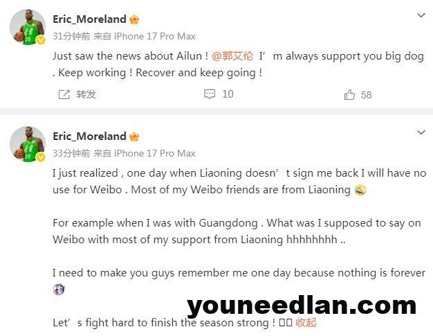 莫兰德还继续谈到自己本赛季重返辽宁男篮效力的感受:“我突然意识到,如果有一天辽宁男篮不再与我续约,我的微博可能就没什么用。我的大多数微博好友都来自辽宁,比如我在广东男篮效力时,面对大部分支持我的辽宁球迷,我在微博上该说什么?我需要让你们记住我,因为没有什么是永恒的。让我们一起努力,争取在赛季结束时取得好成绩!”