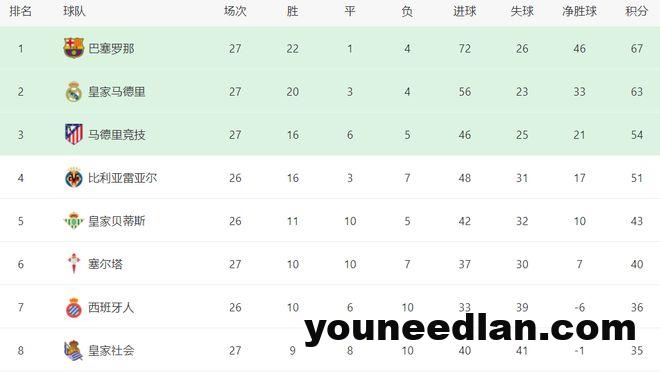 在积分榜上,巴萨排名榜首。巴萨战绩是22胜1平4负,拿到67分。而只拿到63分的皇马排名第2,落后巴萨4分。马竞赢球之后,总积分达到54分,排名第3,与身前的两支球队差距依然很大。比利亚雷亚尔以51分排名第4。第5的是皇家贝蒂斯,拿到了43分。