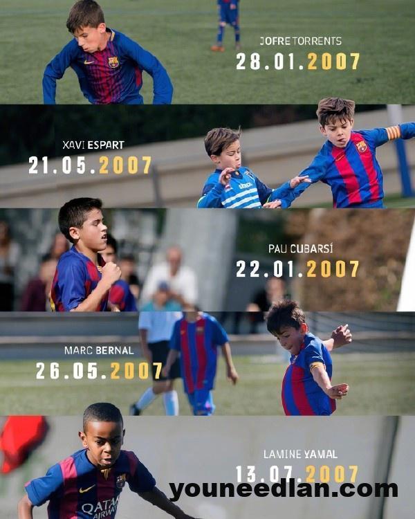 在见证了87一代的辉煌后,拉玛西亚又涌现出一批新的天才。恰好比87一代小了20岁,同样都生于2007年的亚马尔、库巴西和贝尔纳尔组成了全新的三人组。跟他们一样,出生于2007年的还有埃斯帕特和托伦茨。