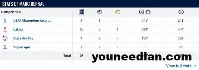 本赛季贝尔纳尔复出之后,已经为巴萨在各项赛事中出战26场,一共踢了970分钟。弗里克最初对他的使用非常耐心,直到德容受伤后,才让贝尔纳尔重新成为先发,出任球队后腰。
