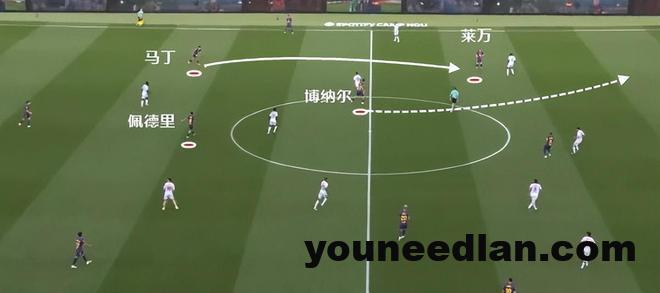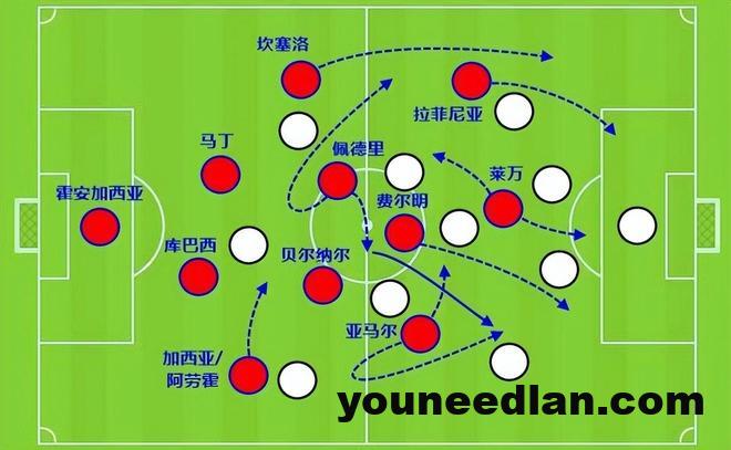 关键点还是因为有了佩德里,通过后者拖后,一来保证传球和推进的稳定性,二来也能做好攻防转换时的选位,这样一来,贝尔纳尔利用自己阅读比赛和洞察空间的能力适时前插,可以起到不错的效果。