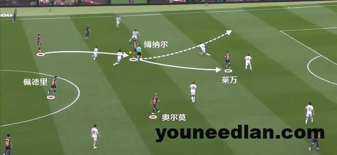 虽然之后皮球没有给到贝尔纳尔这一侧,不过通过佩德里的传球找到了中路奥尔莫的机会。
