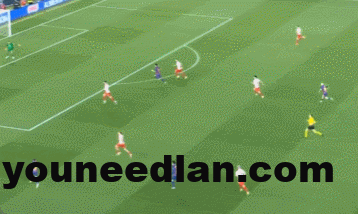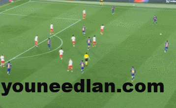 就像是这一波的进攻,贝尔纳尔在莱万和中卫之间做了一次桥梁,分球给到莱万后,他也是第一时间往侧翼跑。