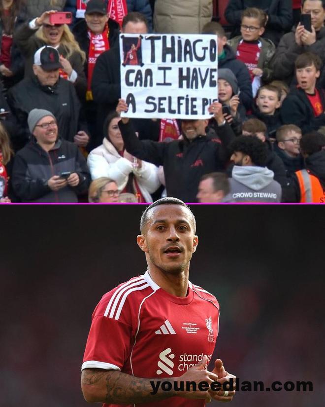现场球迷拍摄到,克洛普高举一块手写标语牌,向昔日弟子蒂亚戈发出合影邀约,牌面清晰写着:“蒂亚戈,能和我合张影吗?”