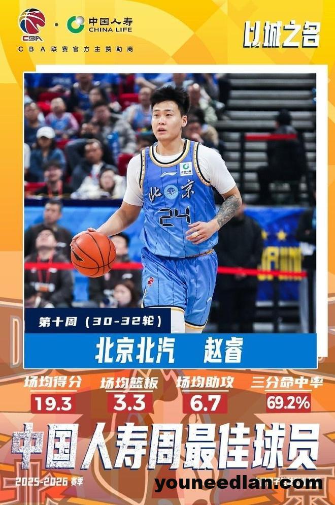 北京时间3月31日,CBA官宣常规赛第10周的周最佳奖项,中国男篮队长赵睿迎来久违的爆发,他率领北京本周3战全胜,且贡献接近7成三分准星,场均接近19+3+7表现神勇,让他时隔7年生涯第2次当选本土周最佳,广厦外援塔克场均接近26+7+9当选外援周最佳。