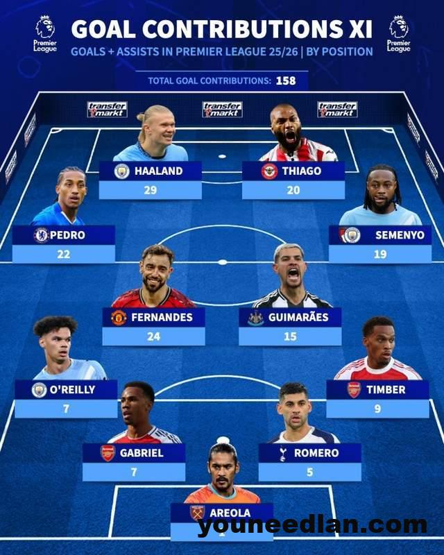 中场:若昂·佩德罗(切尔西,22球)、B费(曼联,24球)、吉马良斯(纽卡,15球)、塞梅尼奥(伯恩茅斯/曼城,19球)