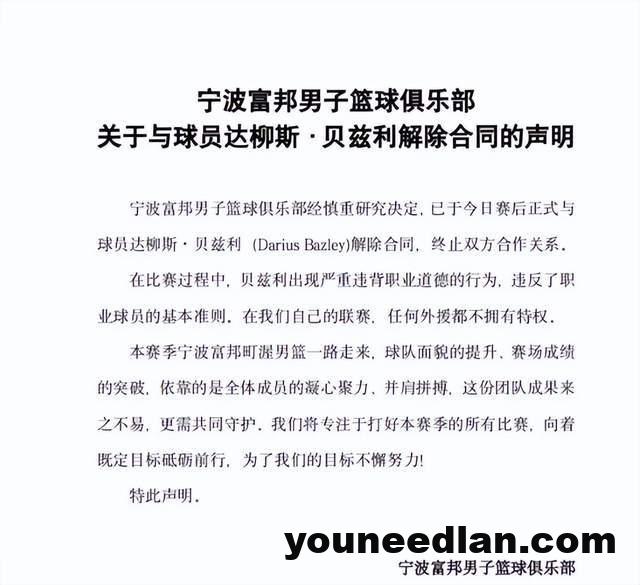 赛后不到一小时,宁波富邦男篮俱乐部火速发布官方声明:“经慎重研究决定,正式与球员达里厄斯·贝兹利解除合同。在比赛过程中,贝兹利出现严重违背职业道德的行为,违反了职业球员的基本准则。在我们自己的联赛,任何外援都不拥有特权。”措辞之严厉、反应之迅速,在CBA历史上极为罕见。