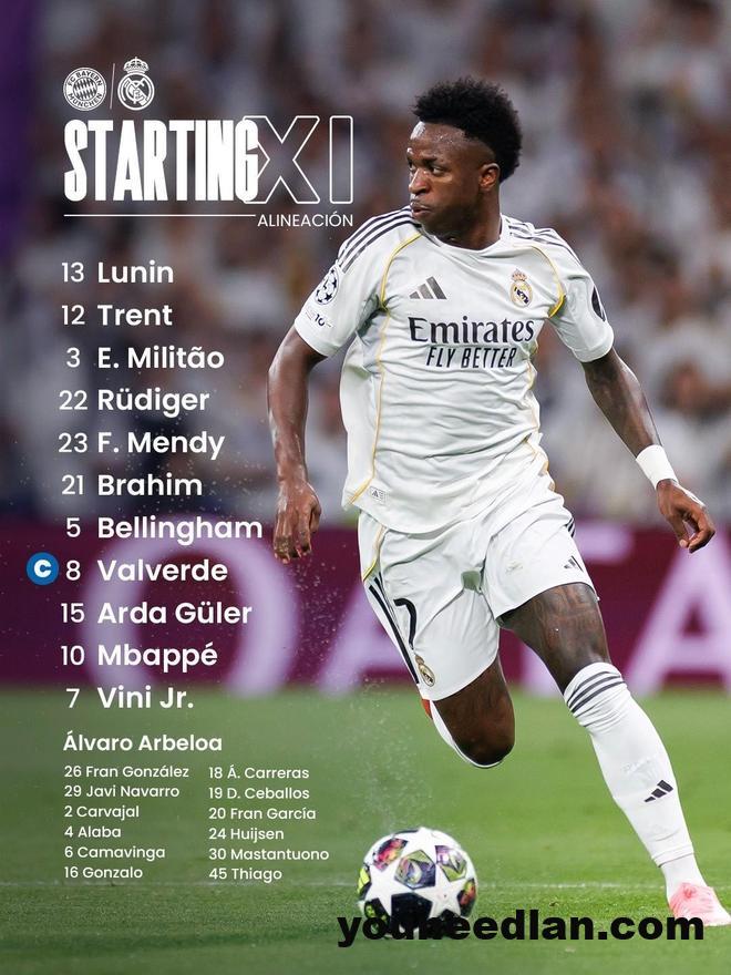 皇家马德里首发:13-卢宁、12-亚历山大-阿诺德、3-米利唐、22-吕迪格、23-费兰-门迪、5-贝林厄姆、8-巴尔韦德、21-卜拉欣-迪亚斯、15-居莱尔、7-维尼修斯、10-姆巴佩
