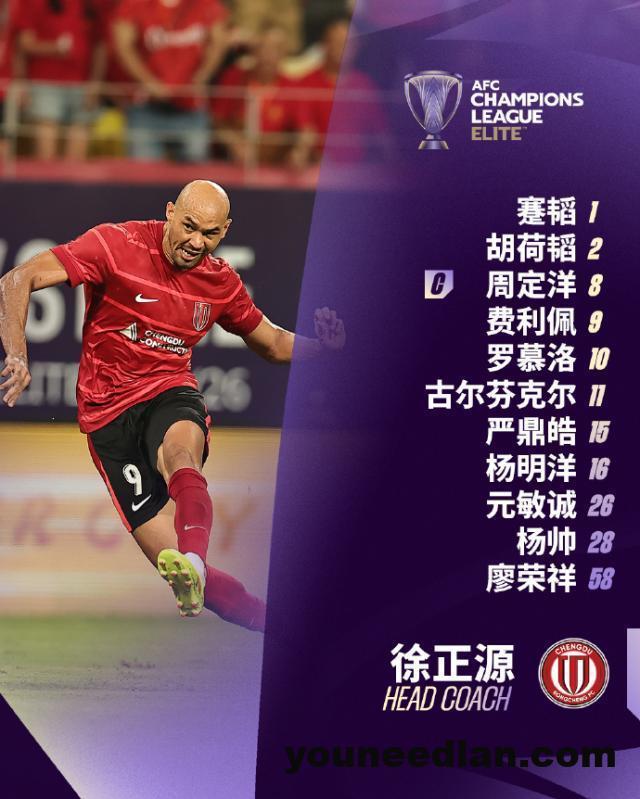 9月30日20:15,2025-2026亚冠精英联赛东亚区第2轮,成都蓉城对阵江原FC。