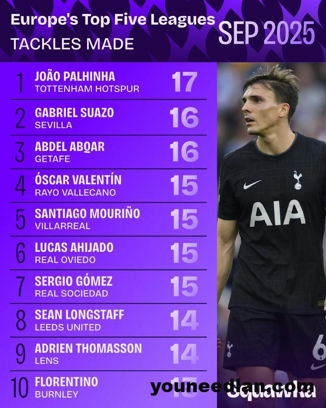 当地时间10月1日,知名数据机构Squawka发布了五大联赛九月份铲球榜,热刺中场帕利尼亚以17次铲球位居榜首。
