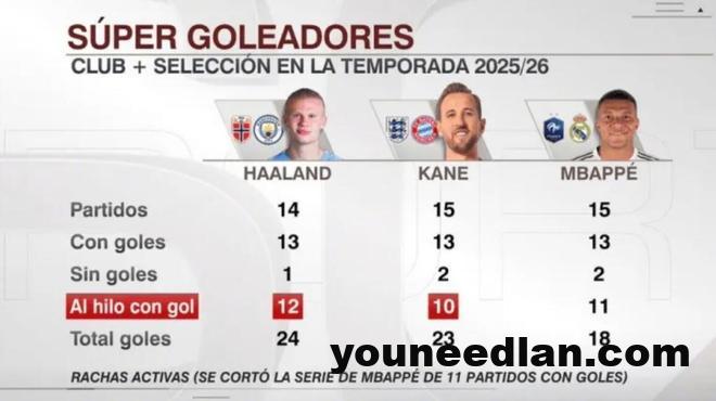 进入25-26赛季后,凯恩、哈兰德以及姆巴佩三名顶级射手集体迎来了大爆发。根据ESPN的最新统计,姆巴佩在俱乐部以及国家队里一共出战了15场比赛,贡献了18粒进球和4次助攻。凯恩的国家队加俱乐部出场次数同样是15场,他的数据是23粒进球和3次助攻,一个人直接参与了26粒进球。但效率如此惊人的凯恩,仍旧只能排名第二,因为哈兰德的表现则更加逆天,他在14场比赛里贡献了24粒进球和3次助攻,一个人制造了27粒进球!