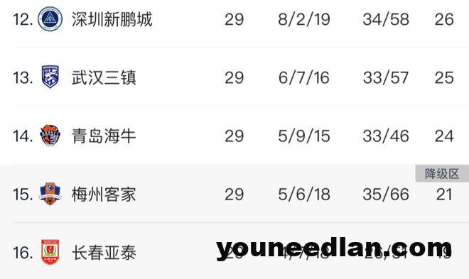 本轮过后,深圳新鹏城、武汉三镇已经提前上岸,而长春亚泰则提前降级。中超最后1个保级席位,将在青岛海牛和梅州客家之间展开。