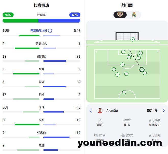 从统计数据可以看到,巴列卡诺的预期进球是1.2比0.98领先皇马,绝佳得分机会也比皇马多1次。