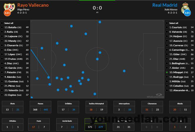 应该说两支球队在场面上是势均力敌的,皇马没有展现出任何的优势。这也跟姆巴佩的接球习惯有关系。他在本场比赛中,一共才在巴列卡诺禁区内触球3次,跟上一场与利物浦比赛时是一样的。