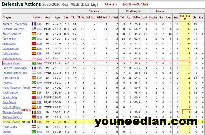 另外还有一个数据,就是姆巴佩本赛季西甲前11轮踢完后,他的抢断和拦截数据依旧是0。要知道哪怕是皇马的门将库尔图瓦,都比姆巴佩多贡献了1次抢断。皇马全队只有3人攻防数据贡献为0,其他两位是出场54分钟的阿拉巴和出场不到10分钟的恩德里克。